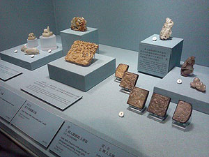 臺北故宮博物院的第三層展出的是圖書、字畫、碑帖、玉器、雕鏤和織繡。玉器展臺上讓人叫絕的是一棵清朝的翡翠玉白菜。玉器匠人將一塊半白半綠的翡翠為料,應用玉料天然色采的散布,紅色局部砥礪成菜幫,一絲一縷清楚;綠色局部砥礪成白菜葉子,高低升沉、一收一放天然,活靈靈一棵新穎的白菜,柔嫩欲滴,恍如一捏會流出水來。更叫絕的是,白菜葉子上微黃的局部砥礪成兩只蟈蟈,正在吃白菜,讓你不敢高聲喘息,恐怕驚跑了它們。這棵翡翠玉白菜是清末瑾妃的陪嫁物品,放在永和宮內,白菜寄意潔白,意味新娘純正;蟈蟈生殖力強,意味多子多福。
